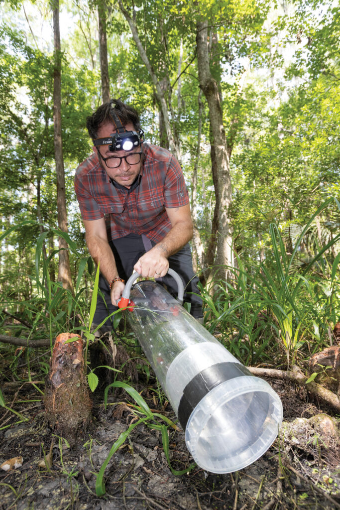 Reeves’ work takes him to the front lines of mosquito hunting, tromping through swamps and along river banks in search of newly arrived species. At the Florida Medical Entomology Lab near Vero Beach, he uses DNA to catalog types of mosquitoes and their ranges — information that can be crucial to the state’s 63 mosquito control districts. By analyzing the DNA in mosquito blood meals, Reeves also sheds new light on how pathogens move through the environment and potentially affect humans.